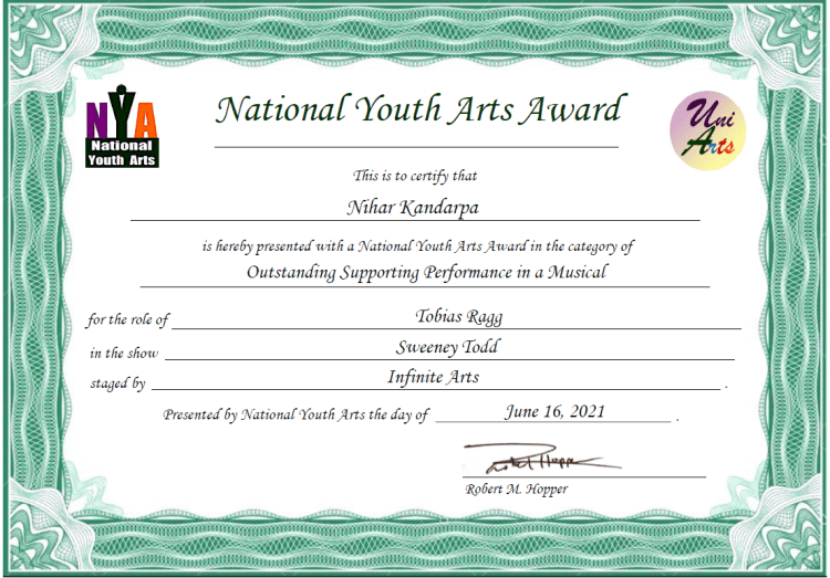 Award winner as “Outstanding Supporting Performer” in 2019 by National Youth Arts for my role as “Tobias” in the musical “Sweeney Todd”